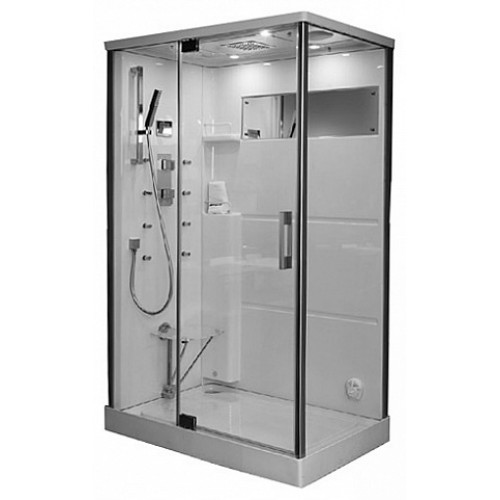 Комплектация: гидромассаж (спинной массаж, массаж ног), прозрачное стекло, сенсорная панель управления, турецкая баня, подсветка, вентиляция, зеркало, прием телефонных звонков, радио, подключение CD, озонирование, верхний и ручной душ, акриловый поддон белого цвета, профиль серебристо-матового цвета. Размер 120х80х215 см. Страна производитель-Китай.