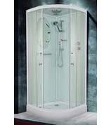 Душевая кабина, верхний и ручной душ, смеситель, стеклянная полка, сиденье. Переднее стекло прозрачное в полоску. Размер 90х90х215 см. Страна производитель-Россия.
