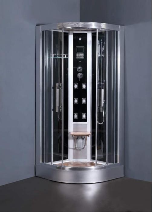 Душевая кабина, низкий поддон. Передние шторки из закаленного безопасного стекла 5 мм (тонированное), с широкими аллюмин. полированными профилями ■ задняя стенка стеклянная, центр. гидромассажная колонна с 6-ю г/м форсунками, смесителем, сенсорным дисплеем, деревянное сидение ■ поддон низкий акриловый 170 мм на металлическом каркасе с регулируемыми ножками, со съёмной алюминиевой фронт. панелью, и европейским (широким) сливом ■ настил для поддона из влагостойкой древесины ■ крыша из влагостойкой древесины с верх. душем, динамиком, вентилятором, и светильниками (хромотерапия) ■ FM-радио ■ душевая лейка со шлангом на штанге ■ стеклянная полка. Размер 90*90*215 см. Страна производитель-Китай.