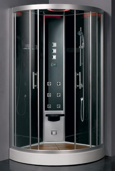 Душевая кабина. Комплектация: гидромассаж, FM радио, вентилятор, алюминиевый профиль сатин серебро, задняя панель из черного стекла, верхний душ, хромотерапия, откидное пластиковое сиденье черного цвета, легко скользящая раздвижная дверь, пульт управления F8, душ-лейка, дозатор для шампуня, парогенератор, ароматерапия. Размер 95*95*230 см. Страна производитель-Китай.