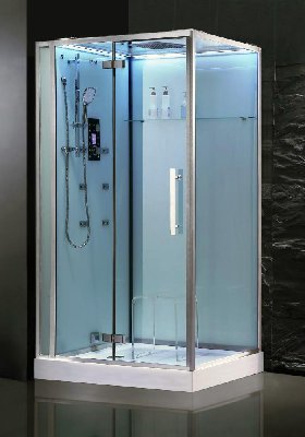 Душевая кабина, левый разворот. Тропический душ, душевая лейка на стойке, MP3; парогенератор (3 кВт); сенсорная ПУ серии F12; "время" и "t" на дисплее; подсветка с хромотерапией, акриловый стул. Передние стекла прозрачные 8 мм (закаленные) - задние белые стеклянные стенки 6 мм (закаленные) - дверь распашная - акриловый поддон - стеклянный потолок - профиль "матовый хром" из алюминия - сенсорный пульт управления - встроенные часы - гидромассаж (6 спаренных форсунок) - верхний душ - душевая лейка на штанге - функция турецкой бани (парогенератор 3 кВт) - функция очистки парогенератора от накипи - ароматерапия - стерилизация озоном - вытяжной вентилятор - FM-приемник - МР3 проигрыватель - USB порт - смеситель с керамическим картриджем -температура воды выводится на экран - подсветка-хромотерапия (7 режимов освещения) - табурет из прозрачного акрила. Размер 120*90*224 см. Страна производитель-Китай.