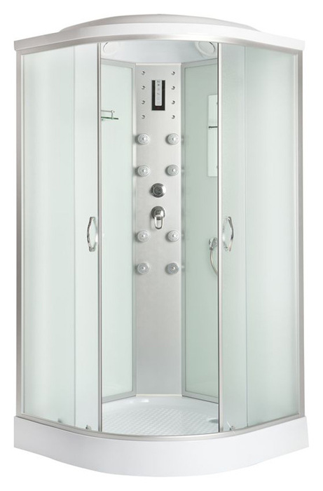 В КОРЗИНУДушевая кабина, форма 1/4 круга, задняя стенка стекло, центральная стойка пластик. Тропический душ, ручной душ, гидромассаж спины (8 форсунок), верхний свет, лунный свет, сенсорный пульт, FM-радио, вентилятор, зеркало, полочка. Низкий поддон 15 см. Размер 90*90*215 см. Страна производитель-Китай.