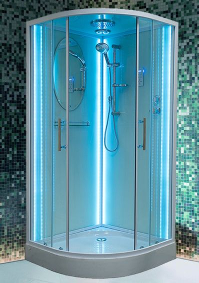 Душевая кабина. Низкий поддон. ПРОЗРАЧНОЕ переднее стекло. "Easy clean glass". БЕЛЫЙ профиль. LED подсветка с хроматерапией. Размер 90*90*210 см. Страна Испания.