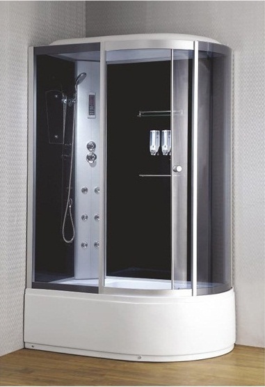 В КОРЗИНУДушевая кабина. Левый или правый разворот. Электронный пульт управления, вентиляция, подсветка, радио, смеситель 3 режима: верхний душ, душ лейка, форсунки для массажа спины, дозатор для шампуня, полка. Размер 120*85*220 см. Страна производитель-Китай.