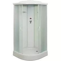 Душевая кабина, задняя стенка белая из стекла, дверцы матовые, центральная стойка пластик, низкий поддон 15 см, тропический душ, ручной душ, зеркало, полочка. Возможен заказ кабины с прозрачными дверцами. Размер 90х90х215 см. Страна производитель-Китай.