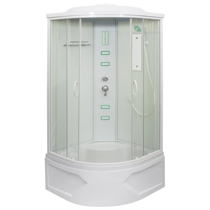 Душевая кабина, задняя стенка белая из стекла, дверцы прозрачные, центральная стойка пластик, высокий поддон 42 см, тропический душ, ручной душ, гидромассаж спины, верхнее освещение, FM-радио, пульт управления, вентиляция, зеркало, полочка. Возможен заказ кабины с матовыми дверцами. Размер 100х100х215 см. Страна производитель-Китай.