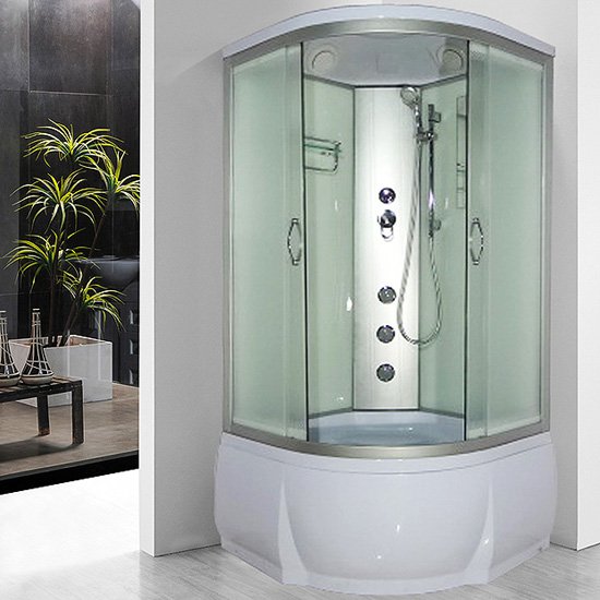 Душевая кабина. Переднее стекло матовое, профиль матовый хром, задняя стенка белое стекло. Верхний душ, 2 вентиляционных отверстия, центральная стойка, штанга, ручной душ 3-х позиционный, смеситель с переключением режимов, 3 г/м форсунки, зеркало, полочка, сиденье. Высокий поддон 46 см со съемным экраном, сифон. Размер 80*80*210 см. Страна производитель-Китай.