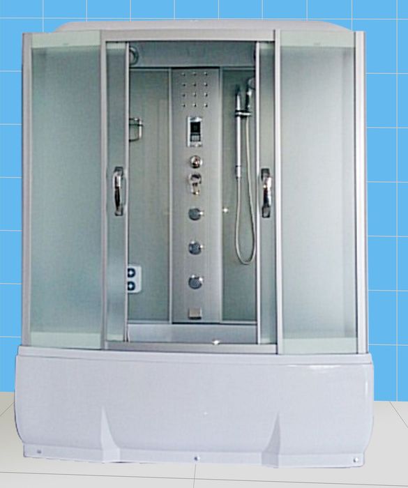 Душевая кабина. Переднее стекло матовое, профиль матовый хром. Верхний душ, верхний свет, лунный свет, динамик, вентилятор, центральная стойка, пульт управления, радио, телефон, смеситель с переключением режимов, 3 г/м форсунки, штанга, ручной душ 3-х режимный, зеркало, полочка, набор воды, г/м ног, подголовник, сиденье. Дополнительно приобретается откидное сиденье. Возможен заказ кабины с тонированным стеклом. Высокий поддон 50 см со съемным экраном, слив-перелив. Возможен заказ в размере 170*80*218 см. Размер 150*80*218 см. Страна производитель-Китай.