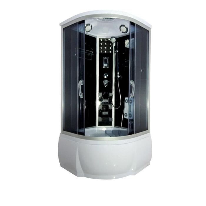 Душевая кабина. Переднее стекло тонированное, профиль матовый хром. Верхний душ, верхний свет, лунный свет, динамик, вентилятор, центральная стойка зеркальная, сенсорный пульт управления, радио, смеситель с переключением режимов, 6 г/м форсунок, штанга, ручной душ 3-х режимный, зеркало, полочка, откидное сиденье. Возможен заказ кабины с матовым стеклом. Высокий поддон 46 см со съемным экраном, сифон. Размер 90*90*210 см. Страна производитель-Китай.