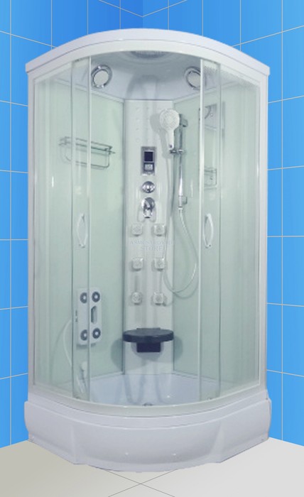 Душевая кабина. Переднее стекло прозрачное, профиль белый. Верхний душ, верхний свет, лунный свет, динамик, вентилятор, центральная стойка, сенсорный пульт управления, радио, смеситель с переключением режимов, 6 г/м форсунок, штанга, ручной душ 2-х режимный, зеркало, полочка. Дополнительно приобретается откидное сиденье. Низкий поддон 26 см со съемным экраном, сифон. Размер 90*90*210 см. Страна производитель-Китай.