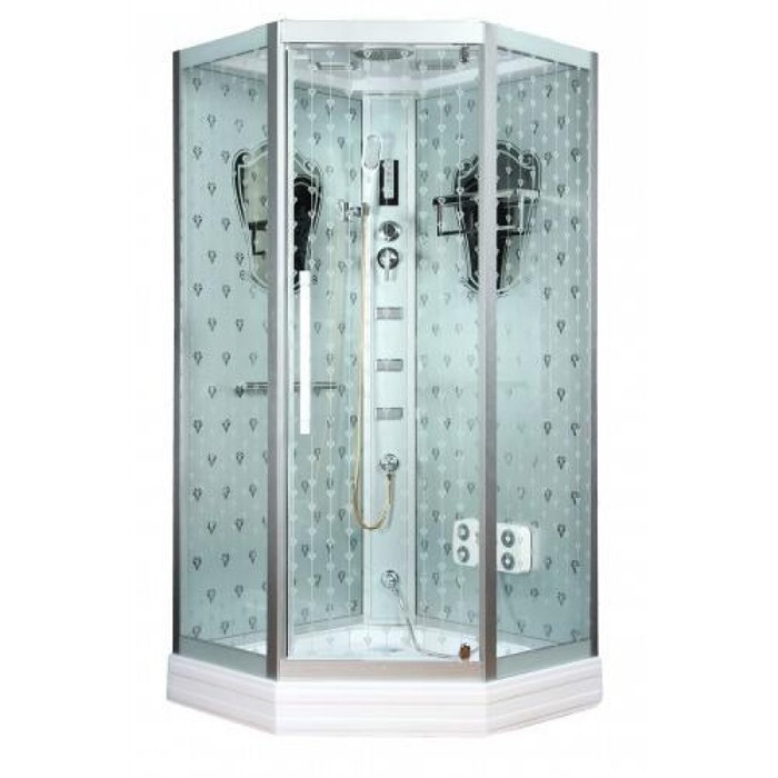 Душевая кабина. Задняя и боковые стенки - крашеное белое или золотистое непрозрачное узорчатое стекло 5 мм. Фронтальное стекло - прозрачное 8 мм. Центральная стойка стекло 8 мм. Верхний душ, верхний свет, динамик, вентилятор, сенсорный пульт, радио, 3 большие прямоугольные форсунки, ручной душ с креплением, смеситель с переключателем режимов, полочка, 2 зеркала, г/м ног. Низкий поддон, сифон с гофротрубой, распашная дверь. Возможен заказ в размере 100*100*215 см. Размер 90*90*215 см. Страна производитель-Китай.