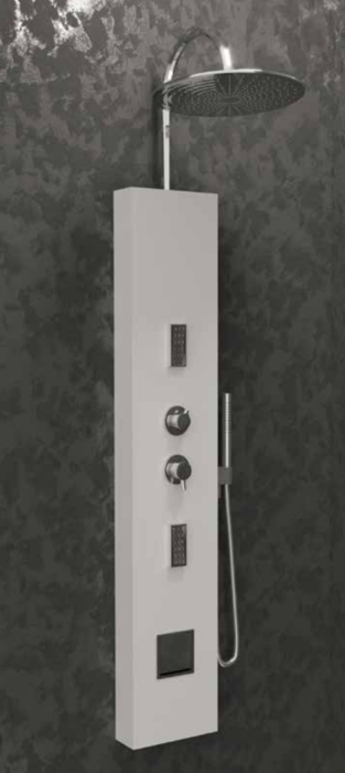 Душевая панель. Корпус из искусственного камня, регулируемый верхний душ, ручной душ, 2 гидромассажные форсунки, смеситель. Возможен заказ панели с каскадным или термостатическим смесителем. Размер 160*25 см. Страна производитель-Словения.