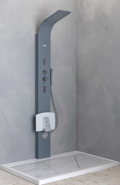 В КОРЗИНУДушевая панель. Корпус из искусственного камня, встроенный верхний душ, ручной душ, 2 гидромассажные форсунки, откидное сиденье, смеситель. Возможен заказ панели с термостатическим смесителем. Размер 210*22 см. Страна производитель-Словения.