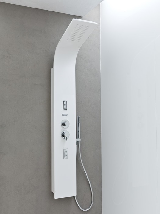 В КОРЗИНУДушевая панель. Корпус из искусственного камня, встроенный верхний душ, ручной душ, 2 гидромассажные форсунки, смеситель. Возможен заказ панели с изливом для ванны или с термостатическим смесителем. Размер 150*22 см. Страна производитель-Словения.