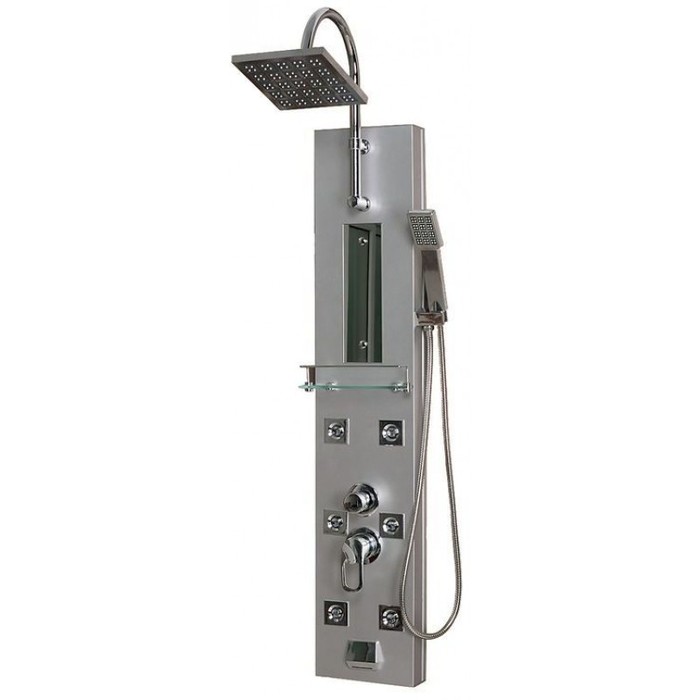Душевая панель. Полочка, зеркало, смеситель с переключ. режимов, верхний душ, ручной душ 3-х режимный с держателем, 6 г/м форсунок, набор воды. Установка на стену или в угол. Размер 110*23 см. Страна производитель-Китай.