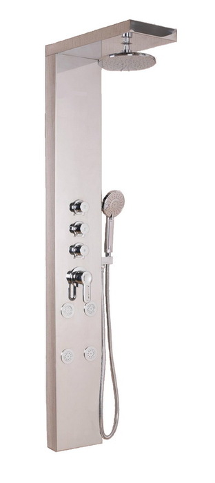 Душевая панель. Корпус нержавеющая сталь, зеркально полированная (марка 304 S/S), смеситель с 3-мя переключ. режимов (высококачественная латунь), верхний душ и, ручной душ 3-х режим с системой EASY CLEAN (ЛЕГКАЯ ОЧИСТКА) и системой аэрации. Гибкий шланг 1,5-2 м с системой ANTI-TWIST (предотвращает скручивание душевой лейки при вращении), латунные гайки с обеих сторон шланга, держатель ручного душа, 4 г/м регулируемых форсунки. Размер 150*25 см. Страна производитель-Китай.