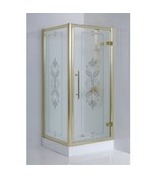 Душевой угол, раздвижные двери. Профиль золото или бронза. Стекло с декором. Возможен заказ с прозрачным стеклом. Поддон заказывается дополнительно. Размер 90*90*195 см. Страна производитель-Германия.