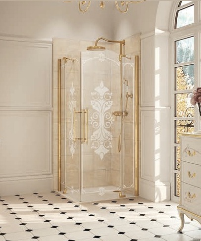 Душевой угол, распашные двери, профиль яркое золото. Стекло с декором. Возможен заказ с профилем в бронзе, с прозрачным стеклом. Поддон заказывается дополнительно. Размер 90*90*195 см. Страна производитель-Германия.