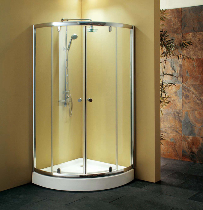 Душевой уголок полукруглой формы, с двумя дверцами. Тип открывания дверей раздвижной. Прозрачное закаленное стекло 6 мм, профиль: глянцевый хром. Дополнительно заказывается поддон. Размер 90*90*190 см. Страна производитель-Германия.