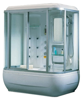Комбинированная ванна. Комплектация: прозрачное стекло, белый профиль, высокий акриловый поддон/ванна на 2 человека, алюминиевый каркас с регулируемой высотой ножек. 6 гидромассажных форсунок в ванне, 6 гидромассажных форсунок на панели и функция турецкой бани. Электронный пульт управления, гидромассаж стоп, вытяжной вентилятор, смеситель, полочки, подголовники, зеркало, слив-перелив, телефон, регулировка температуры, таймер, освещение, FM-приемник, подключение CD. Размеры: 181*112*220 см. Страна производитель-Китай.