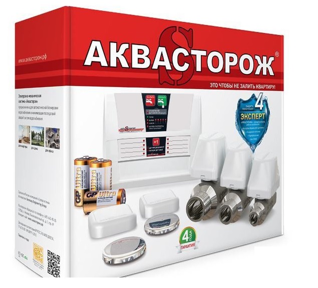 В КОРЗИНУКомплект Аквасторож. 2 крана 1/2‘’(15 мм), контроллер Эксперт + радиобаза, 2 проводных датчика Эксперт (с проводами 2 м и 4 м), 2 беспроводных датчика, блок питания 5.5В, батареи R14 (тип “C”) 3 шт, крепеж. Тип безпроводной. Страна Россия
