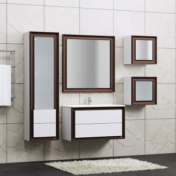 Комплект мебели включает: тумба подвесная, раковина (литьевой мрамор). МДФ, цвет белый глянец/орех античный. Дополнительно приобретается пенал, зеркальный шкафчик, зеркало. Размер 80*45*58 см. Возможен заказ в размере 90*45*58 см. Страна производитель-Россия.