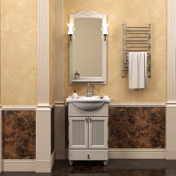 Комплект мебели включает: тумба, керамическая раковина. Массив бука, цвета: Орех антикварный (Нагал, Р46), фурнитура бронза, Белый (Weiss), фурнитура бронза, Слоновая кость (1013), фурнитура бронза, Белый (9003) с фурнитурой хром. Дополнительно приобретается пенал, зеркало. Размер 56*45*88 см. Страна производитель-Россия.