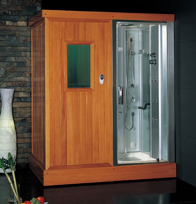 Блок из паровой кабины и финской сауны с ИНФРАКРАСНЫМ нагревом воздуха (печка - каменка). Двойная дверь-купе между отделениями: стекло (снаружи) + дерево (внутри). Левое и правое исполнение!