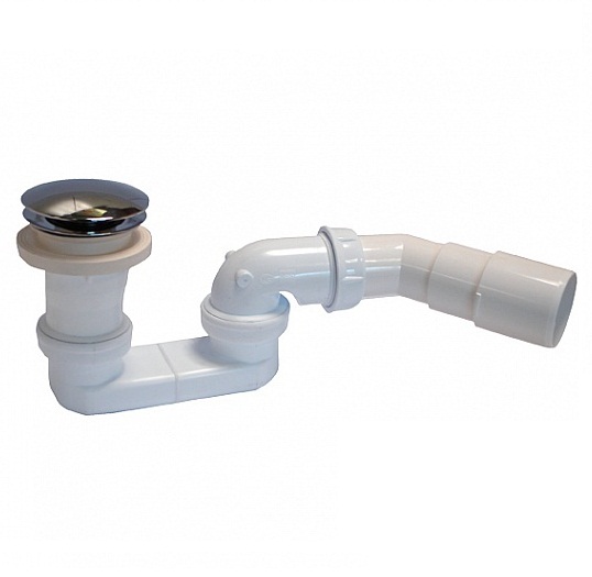 В КОРЗИНУСифон для поддонов Radaway под отверстие в поддоне 50 мм с автоматической пробкой клик-клак, самоочищающийся. Крышка пробки хромированная диаметром 70 мм, угол изгиба сливной трубы 135 град. Производитель Польша