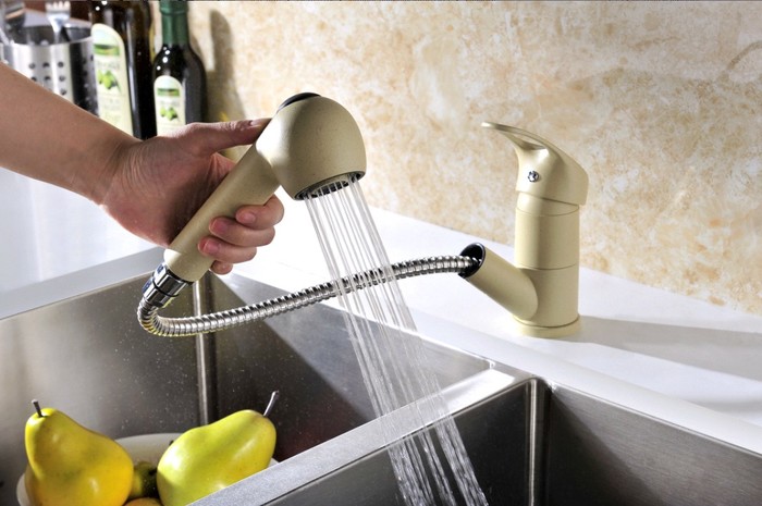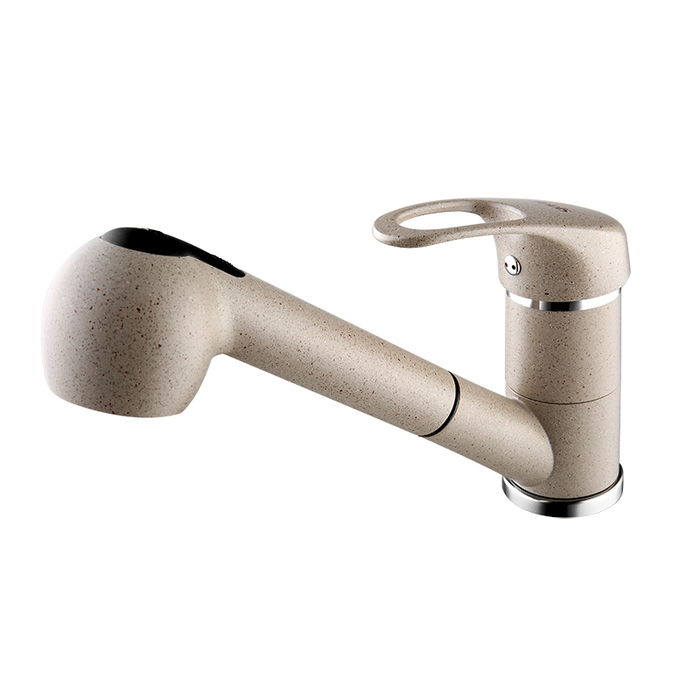 В КОРЗИНУСмеситель для кухни однорычажный с выдвижной лейкой, латунь/гранукрил, цвет песок. Страна производитель-Россия.