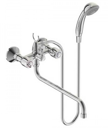 В КОРЗИНУСмеситель для ванны с длинным изливом, цвет хром, в комплекте душевая лейка Ø70 мм, металлический шланг 1500 мм. Страна производитель-Болгария.