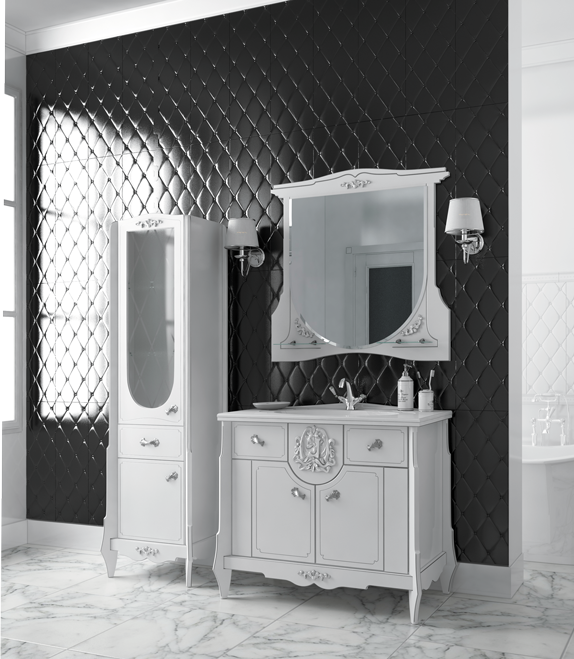 В КОРЗИНУТумба напольная, 2 ящика, 2 дверцы, цвет белый матовый с серебряной патиной. Раковина Гармония 100. Размер 104*49*86 см. Дополнительно приобретается зеркало и пенал. Страна производитель-Россия.