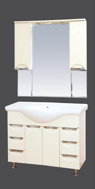 Тумба с раковиной, 6 ящиков, цвет бежевый. Варианты покрытий и цветов: эмаль-бежевая, красная, черная; пленка-черная. Глубина - 310/500 мм, ширина - 1000/1050 мм, высота - 840 мм. Страна производитель-Россия.