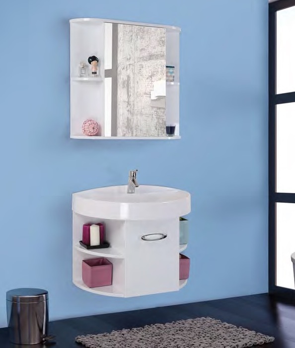 В КОРЗИНУТумба с раковиной подвесная (умывальник FST 75), 1 дверца, полки по бокам. Цвет белый. Размер 75*52*45 см. Дополнительно заказывается зеркало. Страна производитель-Россия.
