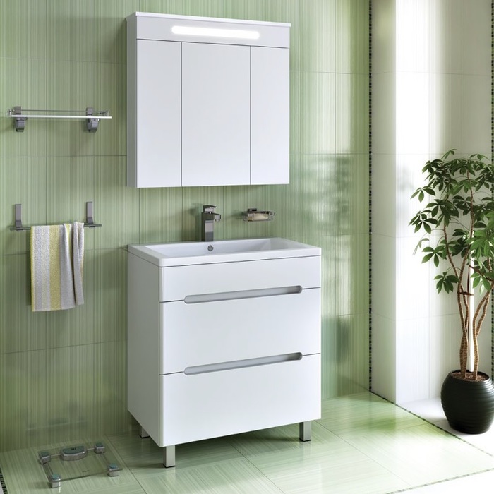 В КОРЗИНУТумба напольная с раковиной из литьевого мрамора, 2 ящика. Цвет белый. Дополнительно приобретается зеркало, пенал. Размер тумбы 74*45,5*80 см. Размер раковины 75*46 см. Возможен заказ размере 60 см. Страна Россия.