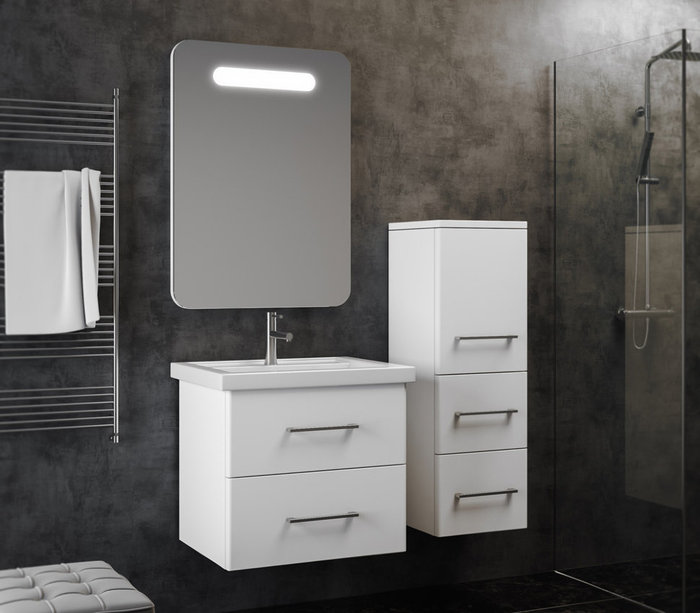 Комплект мебели включает: тумба подвесная, раковина - литьевой мрамор. МДФ, покрытие глянцевая эмаль, цвет белый. Дополнительно приобретается зеркало, пенал. Размер 61*40,5*60,6 см. Страна производитель-Россия.