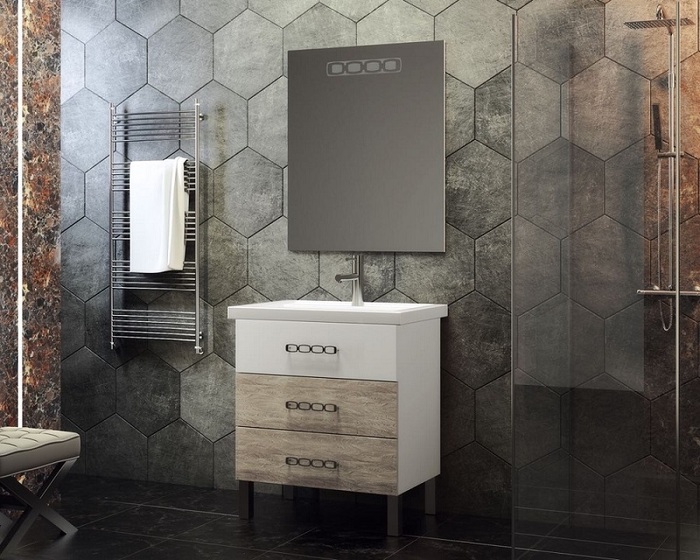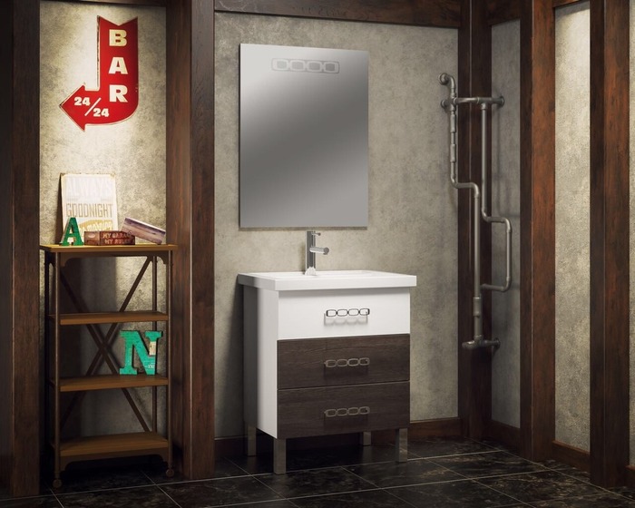 Комплект мебели включает: тумба, раковина - литьевой мрамор. МДФ, цвет белый/винтаж (темный) или белый/орегано (светлый). Дополнительно приобретается зеркало, пенал. Размер 70,5*46*85 см. Страна производитель-Россия.