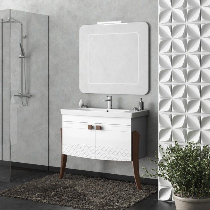 Комплект мебели включает: тумба напольная, раковина - литьевой мрамор. МДФ, цвет - белый. Дополнительно приобретается зеркало. Размер 94,5*45*85,5 см. Страна производитель-Россия.