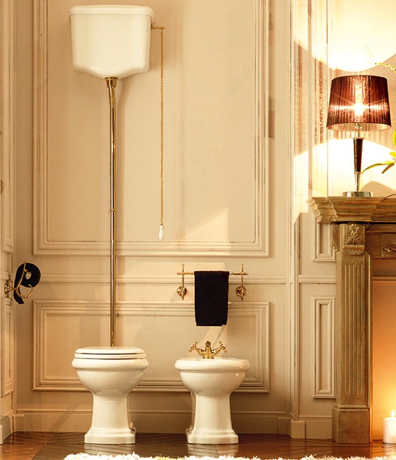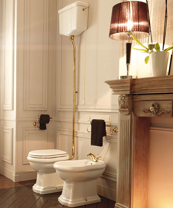 Унитаз напольный, выпуск в пол 1010 01 или в стену 1011 01, бачок 1080 01, труба высокая 7547 91, механизм смыва пластик с цепочкой и ручкой 7546 91, крепеж 7603 91, фурнитура золото. Дополнительно приобретается крышка с микролифтом или без него, цвет: орех, белый, черный. Возможен заказ унитаза с золотой или бронзовой фурнитурой. Страна производитель-Италия.