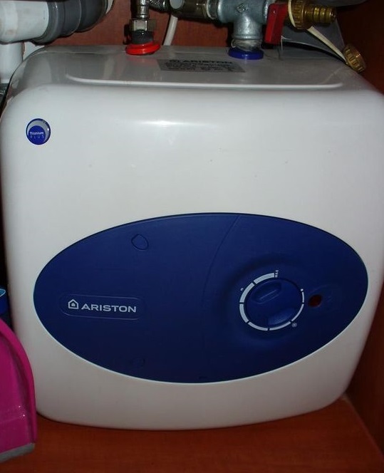 Настенный накопительный электрический водонагреватель с титановым покрытием бака, установка под раковиной. Объем 10 литров, мощность 1200 Вт, напряжение 230 В, максимальное рабочее давление 8 Бар, вес 6,6 кг. Высота 36 см, ширина 36 см, глубина 25 см. Страна производитель-Италия